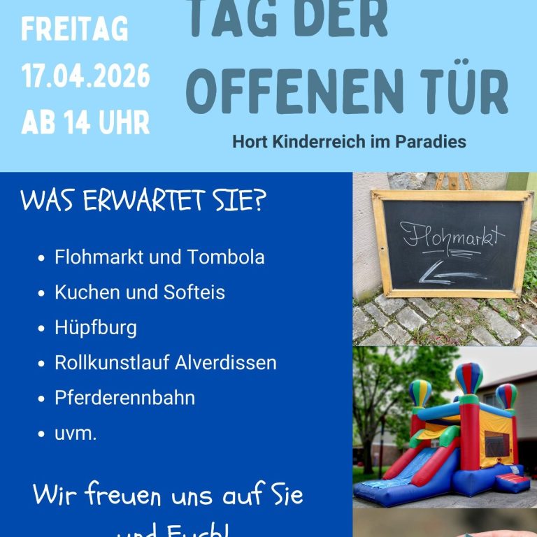 Von 14 - 18 Uhr erwartet Sie ein buntes Treiben in und um den Hort. Sie sind eingeladen, in der Cafeteria zu verweilen, über den kleinen Flohmarkt zu schlendern. Sie können aber auch an unserer großen Tombola mit tollen Preisen teilnehmen oder an unserer allseits beliebten Pferderennbahn Ihr Glück versuchen. Die Kinder können sich in dieser Zeit in der Hüpfburg vergnügen, sich schminken oder mit einem Glitzertattoo verzieren lassen. Zwischendurch können Sie sich auch von einer Rollschuh-Darbietung verzaubern lassen.